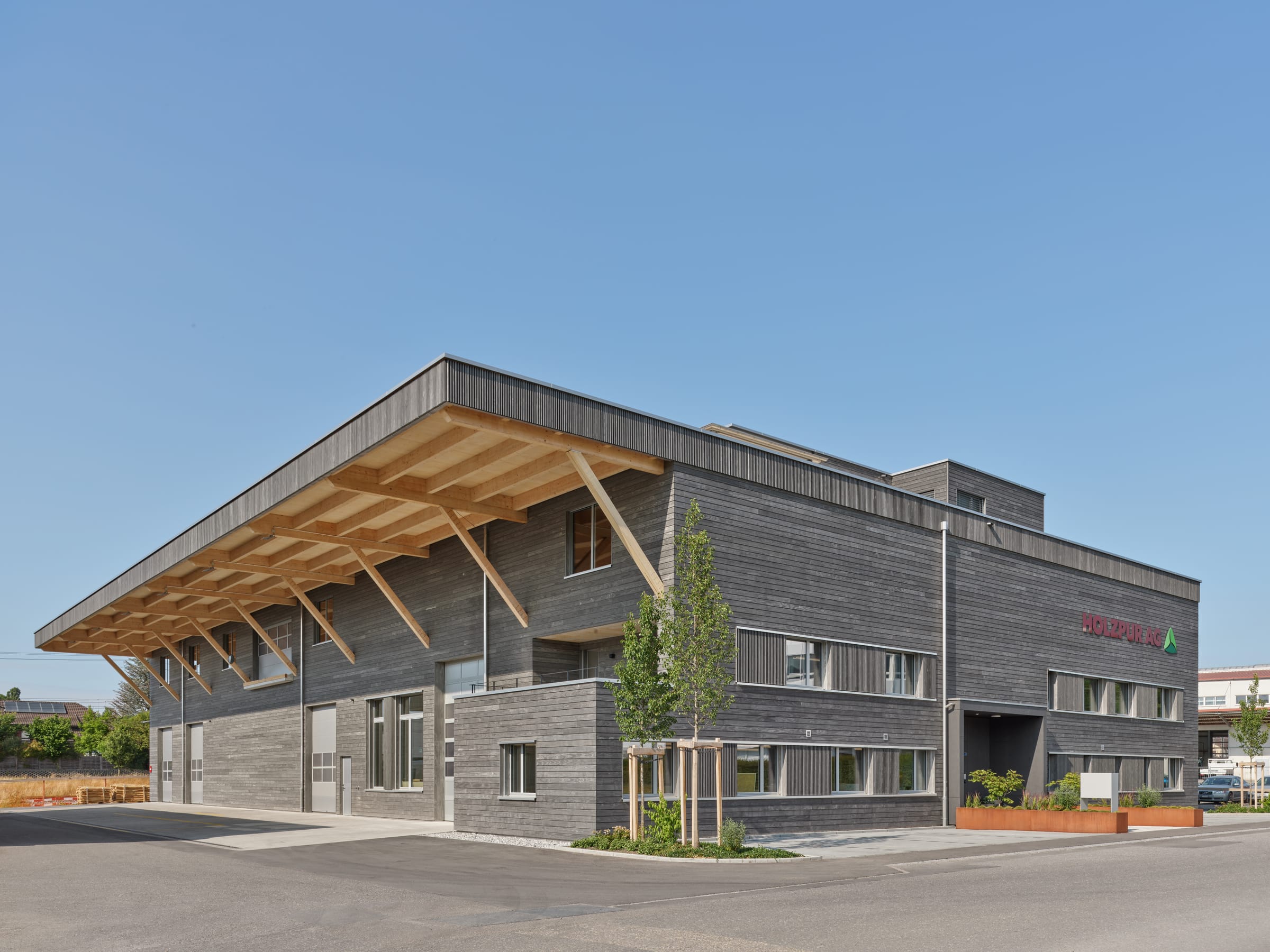 Neubau einer Gewerbehalle mit Bürotrakt für die Holzpur AG in Sempach Station. Markante Holzkonstruktion mit grossem Vordach und funktionaler Raumaufteilung für Produktion und Verwaltung.