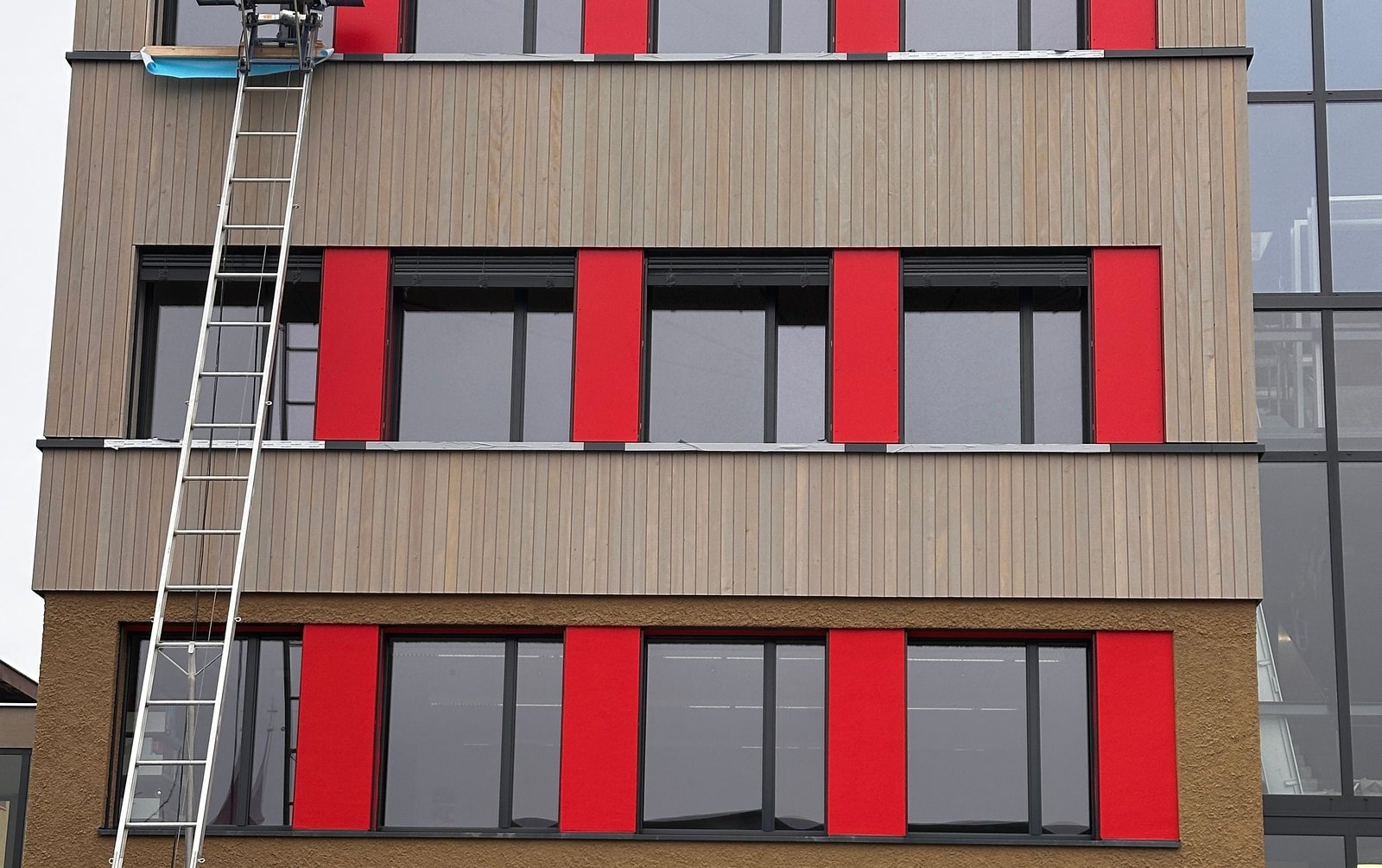 Neubau in Holzbauweise mit markanter Fassadengestaltung. Holzverkleidung mit roten Farbakzenten, sichtbare Holzkonstruktion im Innenraum und anspruchsvolle Haustechnik-Integration. Aktuell in Ausführung.
